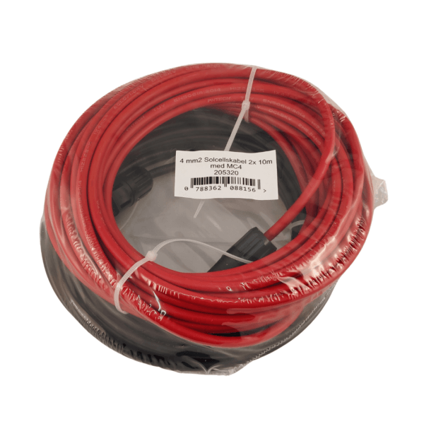 Solkabel som används för att ansluta solpanelen till regulatorn och levereras i en förpackning innehållande två stycken tio meter långa kablar, en röd och en svart med tvärsnittsyta på 4mm². Kabeln är försedd med förmonterade MC4-kontakter, vilket förenklar installationen och eliminerar behovet av en speciell crimptång.