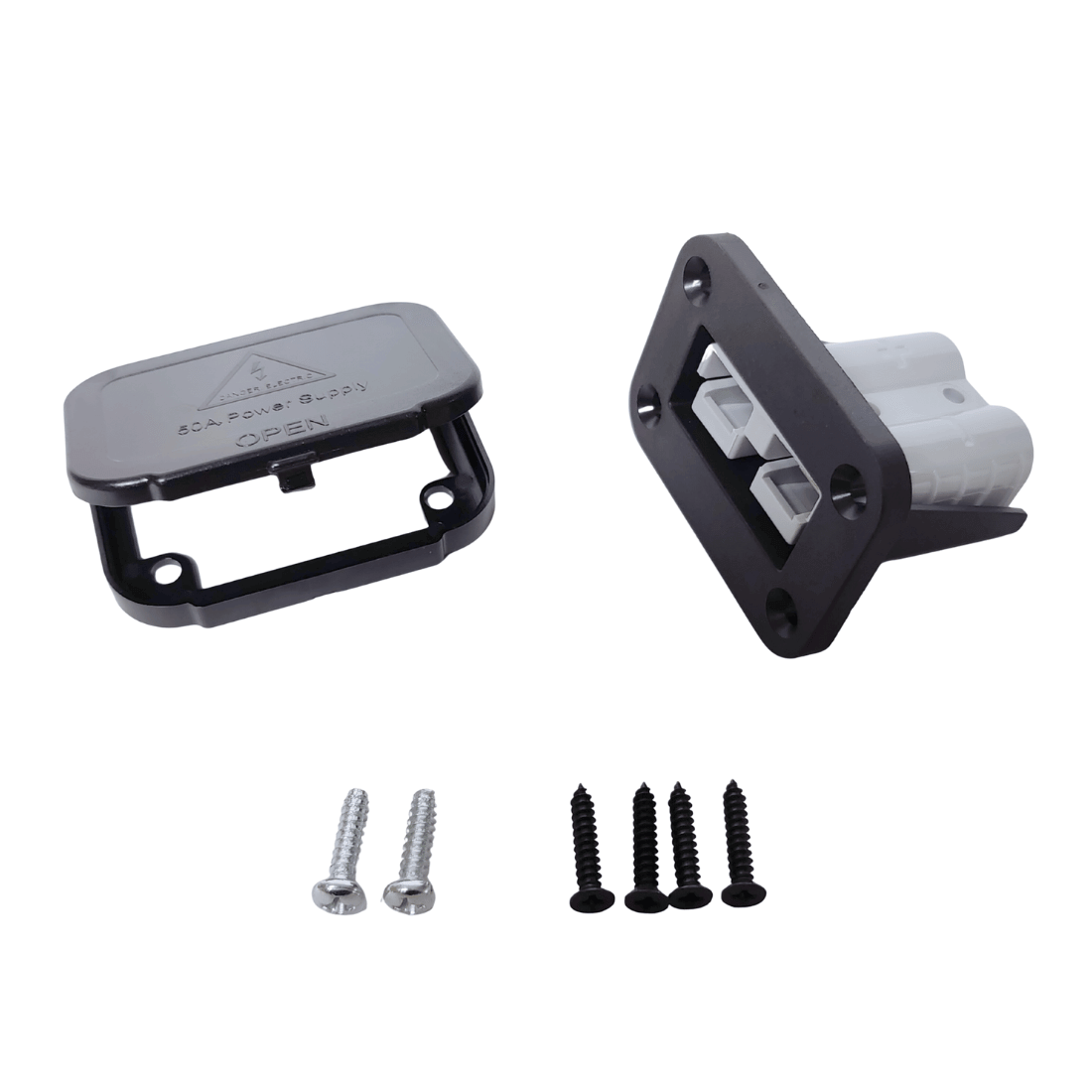 Monteringsram i svart plast med täcklock för infälld montering av Anderson-kompatibla SB50-kontakter, inklusive fästelement och kontaktstycke.