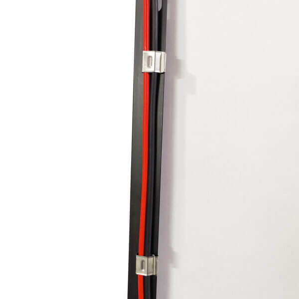 Kabelclips för enkel uppfästning av solcellskabel längs panelramens insida.