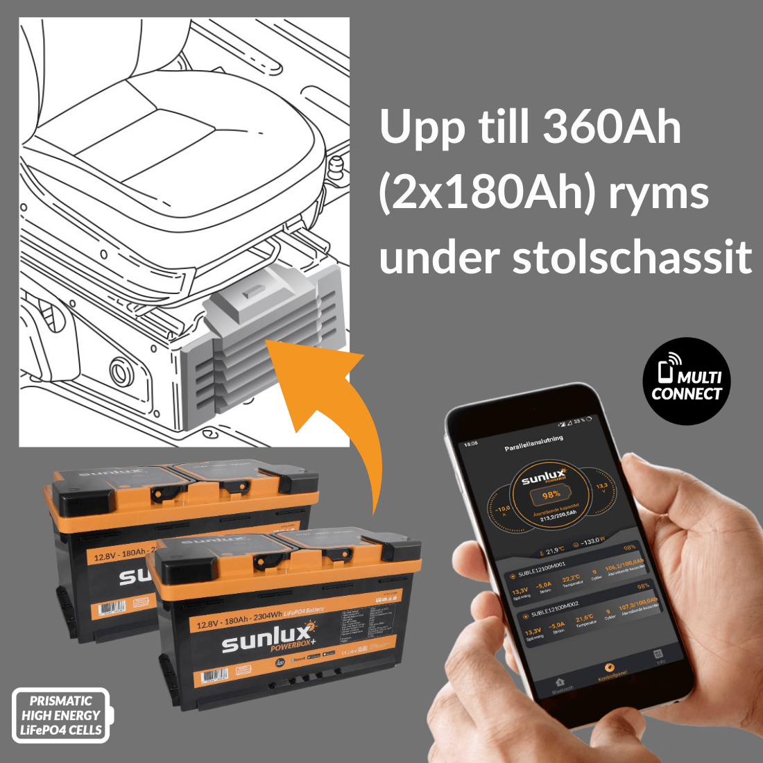 Avancerat LiFePO4 batteri utrustat med en inbyggd Bluetooth och CAN-Bus anslutning. Avsett att användas som förbrukningsbatteri i exempelvis husbilar, husvagnar, båtar och fritidshus. Batteriet passar även för montering under stol på Fiat Ducato/Peugeot Boxer/Citroën Jumper.
