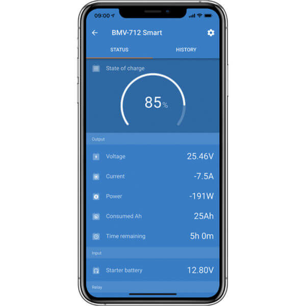 BMV 712 Smart från Victron (MPN BAM030712000R) är den senaste batteridatorn i BMV-familjen. Den ger mycket exakta data om olika parametrar så som batterispänning, ström, effekt, förbrukade amperetimmar, laddningstillstånd och återstående drifttid vid aktuell urladdningsström. Mätupplösningen är mycket noggrann och exakt. Dessutom är den utrustad med en integrerad Bluetooth som gör att du kan få tillgång till många funktioner och statusrapporter från batteridatorn via en gratis app till din Iphone eller Android enhet.
